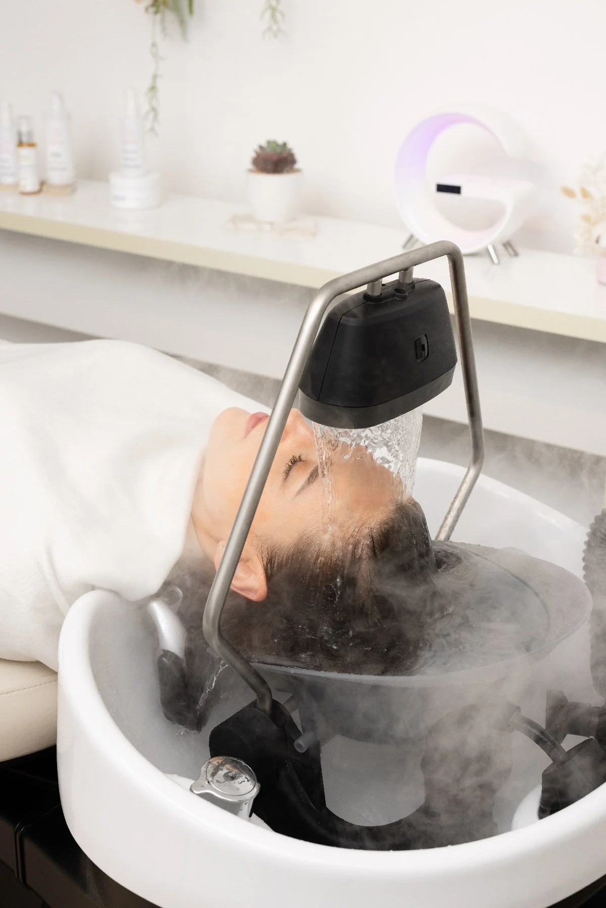 Warm steam is applied to open pores and follicles, enhancing absorption and softening the scalp. This step sets the stage for the star of the show: our signature waterfall massage.